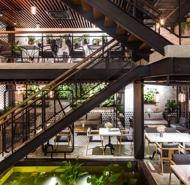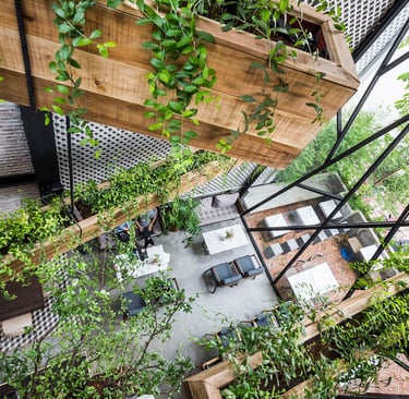 The interior is enveloped by a rich variety of plants — climbing vines, suspended planters and vertically arranged trees — creating a modern interpretation of the legendary Hanging Gardens. On the ground floor, a small pond with aquatic plants sits peacefully beneath the staircase, adding a sense of liveliness and calm to the generously proportioned open seating area. Blackened-steel mezzanines wind upward through the vertical volume, offering intimate private corners ideal for focused work, quiet conversations or reflective moments. A tall living tree rises dramatically from the concrete floor toward the upper levels, further emphasising the seamless fusion between architecture and nature.
