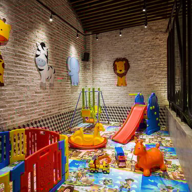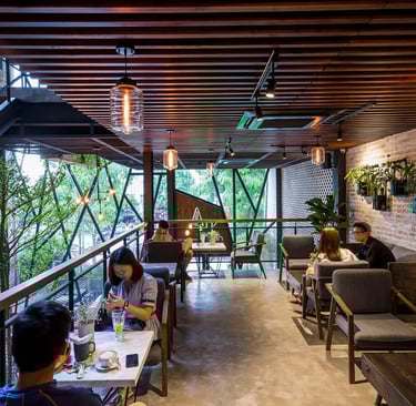 The top floor is crowned with a glazed roof combined with timber louvres that gently filter natural daylight throughout the day. An outdoor terrace lined with bamboo planters provides an airy atmosphere and expansive sky views. Family-friendly details, including a dedicated children’s playground, enhance the café’s versatility and welcoming character.