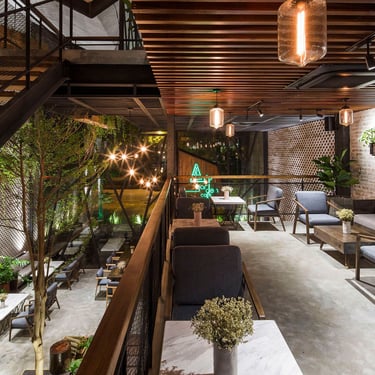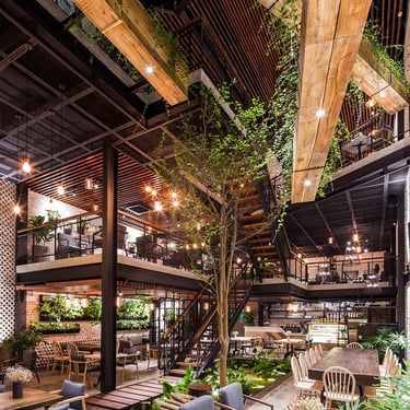 Không gian bên trong được phủ đầy bởi hệ thực vật đa dạng với dây leo, chậu treo và cây xanh bố trí theo chiều cao, gợi nhắc đến hình ảnh “vườn treo” trong cách diễn giải hiện đại. Ở tầng trệt, một hồ nước nhỏ với cây thủy sinh nằm dưới cầu thang mang lại cảm giác sinh động và thư thái, kết hợp cùng khu vực ngồi mở rộng rãi. Các tầng lửng bằng thép đen uốn lượn theo chiều đứng, tạo nên những góc ngồi riêng tư, phù hợp cho làm việc, trò chuyện hoặc suy ngẫm. Một cây xanh lớn vươn từ sàn bê tông lên các tầng trên càng nhấn mạnh sự hòa quyện giữa kiến trúc và tự nhiên.