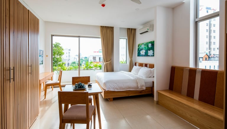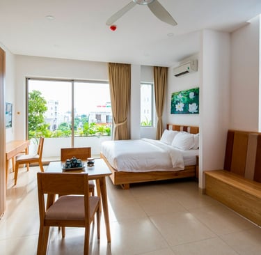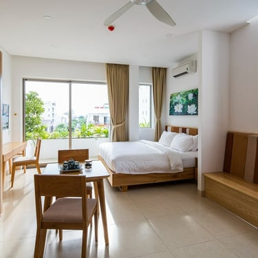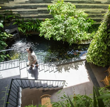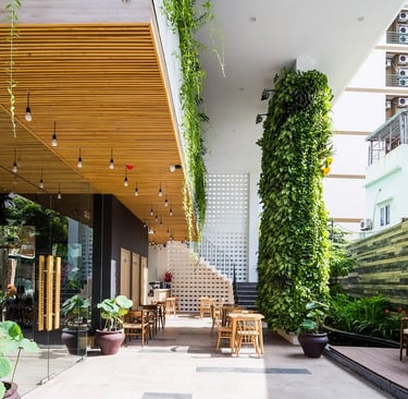 Beyond accommodation, Babylon Garden Condotel enriches the experience through a carefully integrated series of amenities. From the intimate Koi fish lake café nestled within layers of greenery and the warm restaurant to the rooftop bar and relaxation areas, every function contributes to a cohesive emotional atmosphere. Nature does not merely decorate the spaces but actively guides the spatial rhythm, turning every movement into a slow, calming journey.