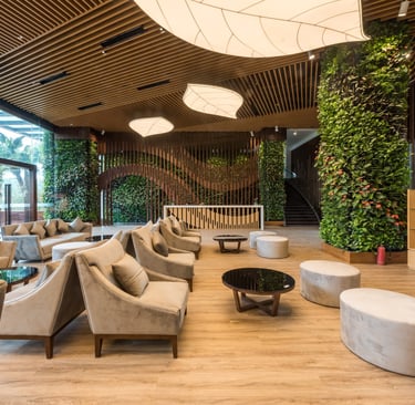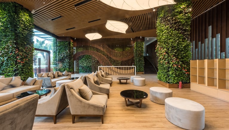 This commitment to the environment has earned the building the prestigious EDGE Advanced green certification. Through a combination of automated ventilation, energy-saving VRV air-conditioning, solar energy, and maximized natural daylight via laminated glass systems, the structure achieves remarkable efficiency. It cuts down energy use by 42%, water consumption by 22%, and embodied energy in materials by 36%. An innovative closed-loop wastewater system treats and reuses 100% of domestic water to irrigate the building's massive vertical flora.