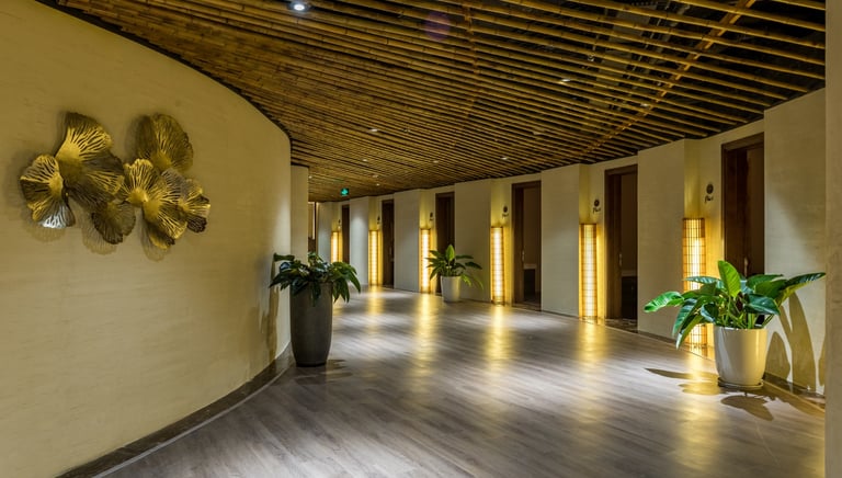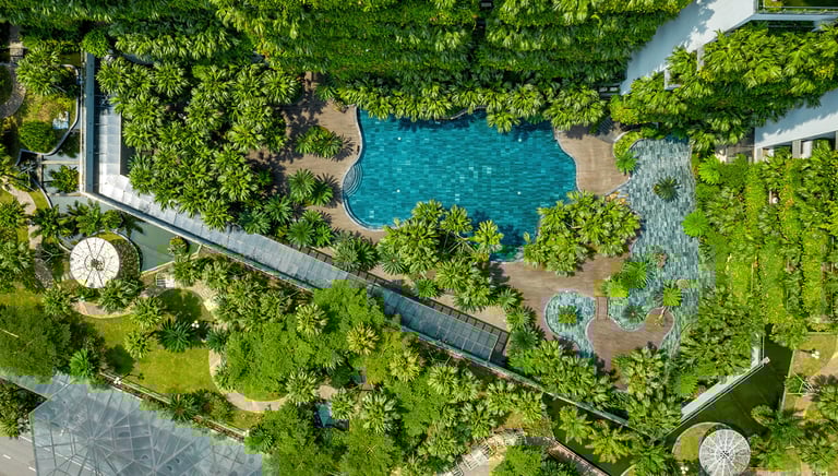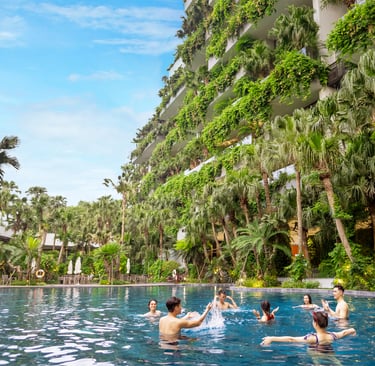 Điểm nhấn của thiết kế không chỉ nằm ở vẻ ngoài ngoạn mục mà còn ở việc xóa nhòa ranh giới giữa không gian bên trong và bên ngoài. Các ban công phủ đầy cây xanh, kết hợp với sàn tre và vách kính khổ lớn, cho phép ánh sáng tự nhiên tràn ngập, mang đến trải nghiệm sống giữa thiên nhiên đích thực ngay trong lòng một khu nghỉ dưỡng đẳng cấp.