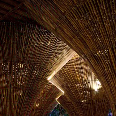 Về kết cấu, mái công trình được nâng đỡ bởi hệ thống 15 cột tre hình nón ngược – lấy cảm hứng từ những chiếc giỏ, đó truyền thống của ngư dân Việt Nam. Hình khối này không chỉ tạo nên hiệu quả thẩm mỹ mà còn tối ưu khả năng thông gió vào mùa hè và tăng độ ổn định trước gió bão. Bên trong, các vòm tre đan xen tạo cảm giác như đang đứng giữa một “khu rừng tre”, đồng thời mở rộng tầm nhìn toàn cảnh ra sông nước và núi non xung quanh.