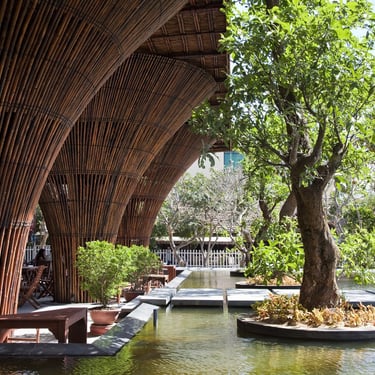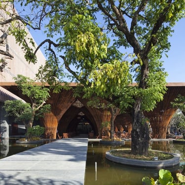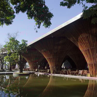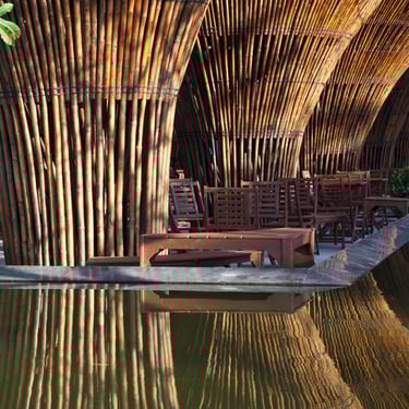 Occupying a corner site, the project consists of two primary components: a semi-open café space sheltered under a large bamboo roof and a secondary kitchen annex constructed from concrete and stone. The rectangular layout is surrounded by a shallow artificial lake, which plays a crucial role in moderating the microclimate.