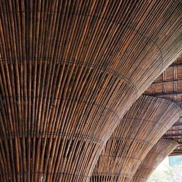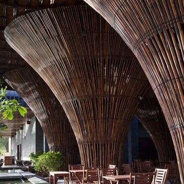 Structurally, the roof is supported by 15 inverted cone-shaped bamboo columns inspired by traditional Vietnamese fishing baskets. This configuration enhances natural ventilation during hot seasons while providing resilience against strong winds. Internally, the bamboo arches create an immersive atmosphere reminiscent of a bamboo forest, while framing panoramic views of the river and surrounding mountains.