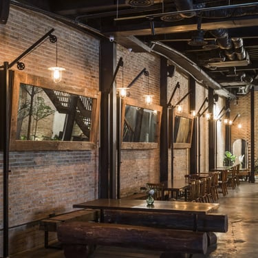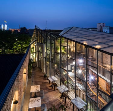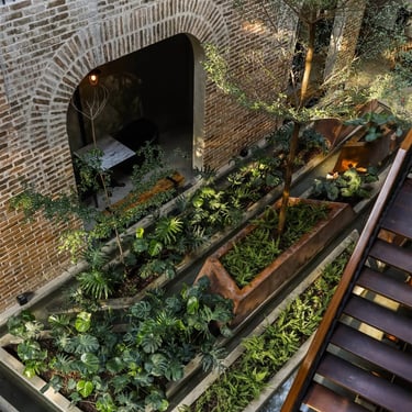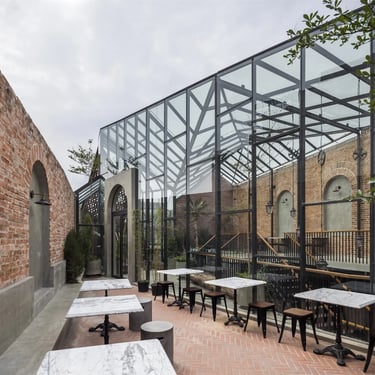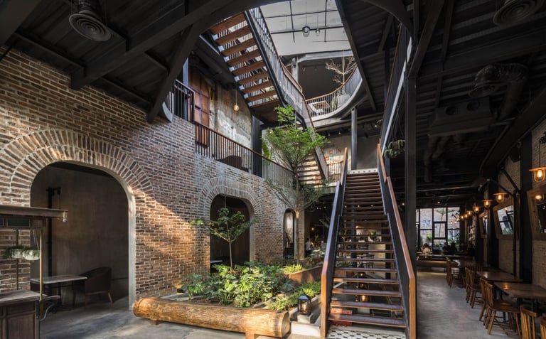 A key strength of the design lies in its sensitive dialogue between old and new. Preserved sections of aged brick walls, bearing the patina of time, stand in quiet conversation with minimalist modern furnishings. Carefully placed greenery acts as a soft unifying element, weaving the past and present into a harmonious whole without forcing artificial contrasts.