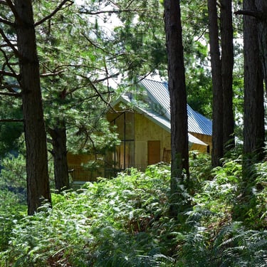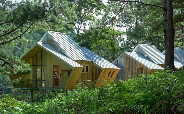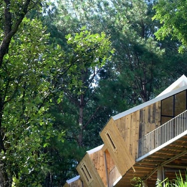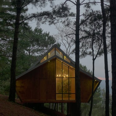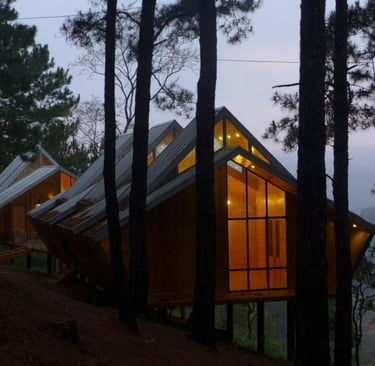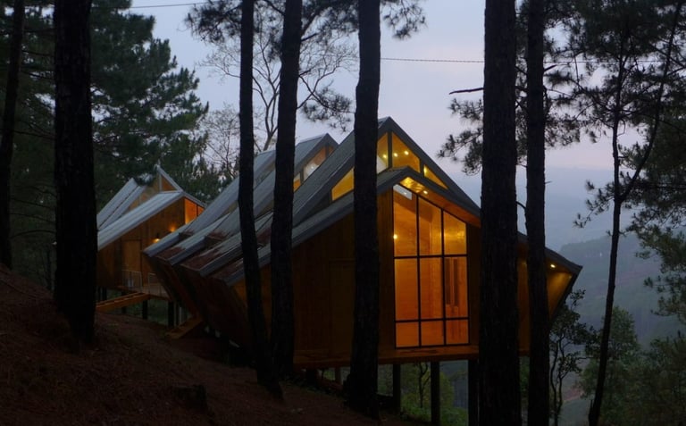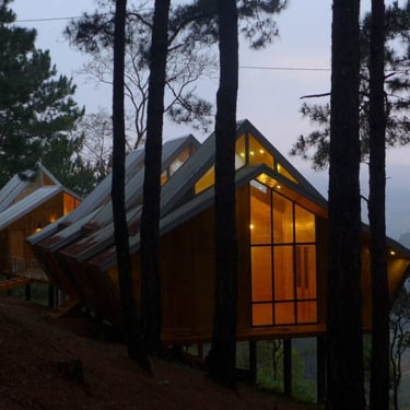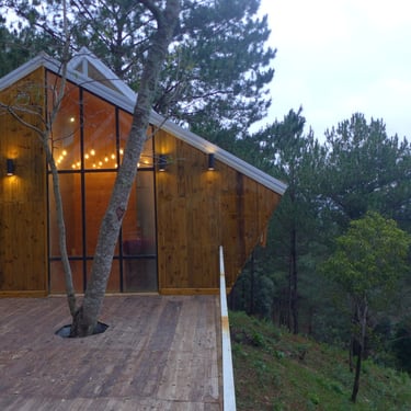 Designed by Mỹ An Architects, the complex consists of two geometric cabin volumes linked by a shared elevated platform supported on stilts, minimising impact on the delicate highland ecosystem. The architecture emphasises openness, encourages interaction, and maintains a strong connection with nature. At the heart of the design lies a generous community terrace that functions both as a welcoming entrance and the primary social hub. A preserved existing pine tree rises through the deck, becoming a living focal point that powerfully expresses respect for the natural environment.